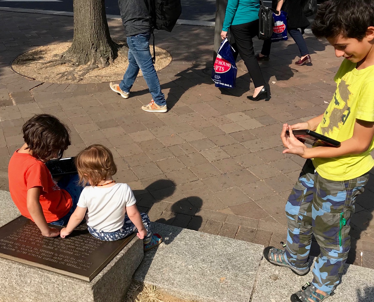 Lunch was a little Korean-run place around the corner that did a bulgoki Philly cheesesteak, among other things, and then we went to the International Spy Museum for the walking tour/spy adventure we had reserved ahead of time. That was a lot of fun: it had the kids doing things like reading the inscription on the FDR memorial, or checking to see which battles a general fought in, according to the inscription on his statue, and we walked all around that side of the mall for about an hour and a half. Of course, it was 88 degrees and sunny, so we were a tad warm, but it was still a nice afternoon.